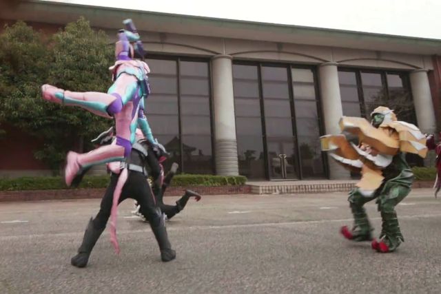 Interessant in dieser Szene finde ich Sakura. Sie ist nämlich die einzige der Zivilisten, die sich den Deadmen stellt, wenn auch nur den Fußsoldaten (die „Giff Junior“). Trotz Kampfsporterfahrung in Karate keine Selbstverständlichkeit. Daher hoffe ich darauf, dass sie genau in dieser Art noch weiter gezeigt wird und ihrem Bruder zur Seite stehen kann. Dass sie ein Kamen Rider werden könnte glaube ich zwar nicht, verkehrt wäre diese Entscheidung allerdings nicht.